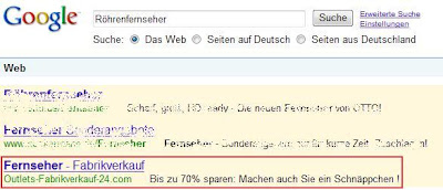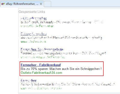 Mir wird in der Zuschrift beschrieben, dass man unter dem Suchbegriff „Röhrenfernseher“ über die gesponserten Links (Werbung) bei ebay auf die Domain outlets-fabrikverkauf-24.com aufmerksam gemacht wird, welche dann auf top-fabrikverkauf.de führt.