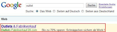 Auf diese (alte) neue Abzockmasche wird man nicht nur über die in den Werbeanzeigen von ebay beworbene Domain outlets-fabrikverkauf-24.com bzw. auf top-fabrikverkauf.de aufmerksam gemacht, sondern (natürlich) auch in den Anzeigen von Google – 74.000.000 Millionen Suchergebnisse zu „Outlet“ und die erste Anzeige ist schon ein Treffer: