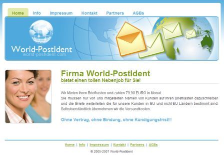 Via Spam bietet Ihnen ein Unternehmen mit dem Namen World-Postident an, für die Weiterleitung von Briefen über Ihren Briefkasten, monatlich € 79,90 zu zahlen.