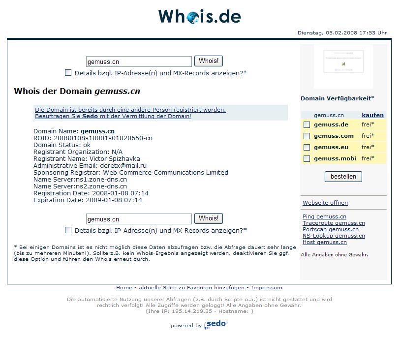 Die hier angegebenen Daten, lassen Rückschlüsse auf den Versuch der Geldwäsche über deutsche Konten vermuten. Die angegebene Mail-Adresse verweist auf Gemuss.cn (CN=China):