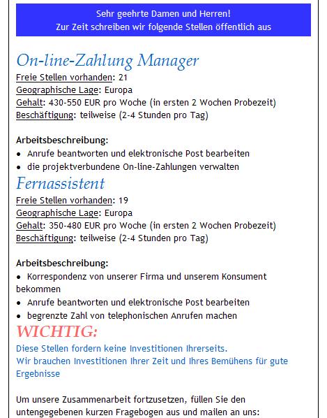 Meist sind die Initiatoren auch schon froh, wenn die Eingabemaske mit Ihren vollständigen Daten ausgefüllt wird. Ein aktueller Datensatz von jemandem, der anfällig für dubiose Jobangebote ist, wird in entsprechenden Kreisen sehr hoch gehandelt.