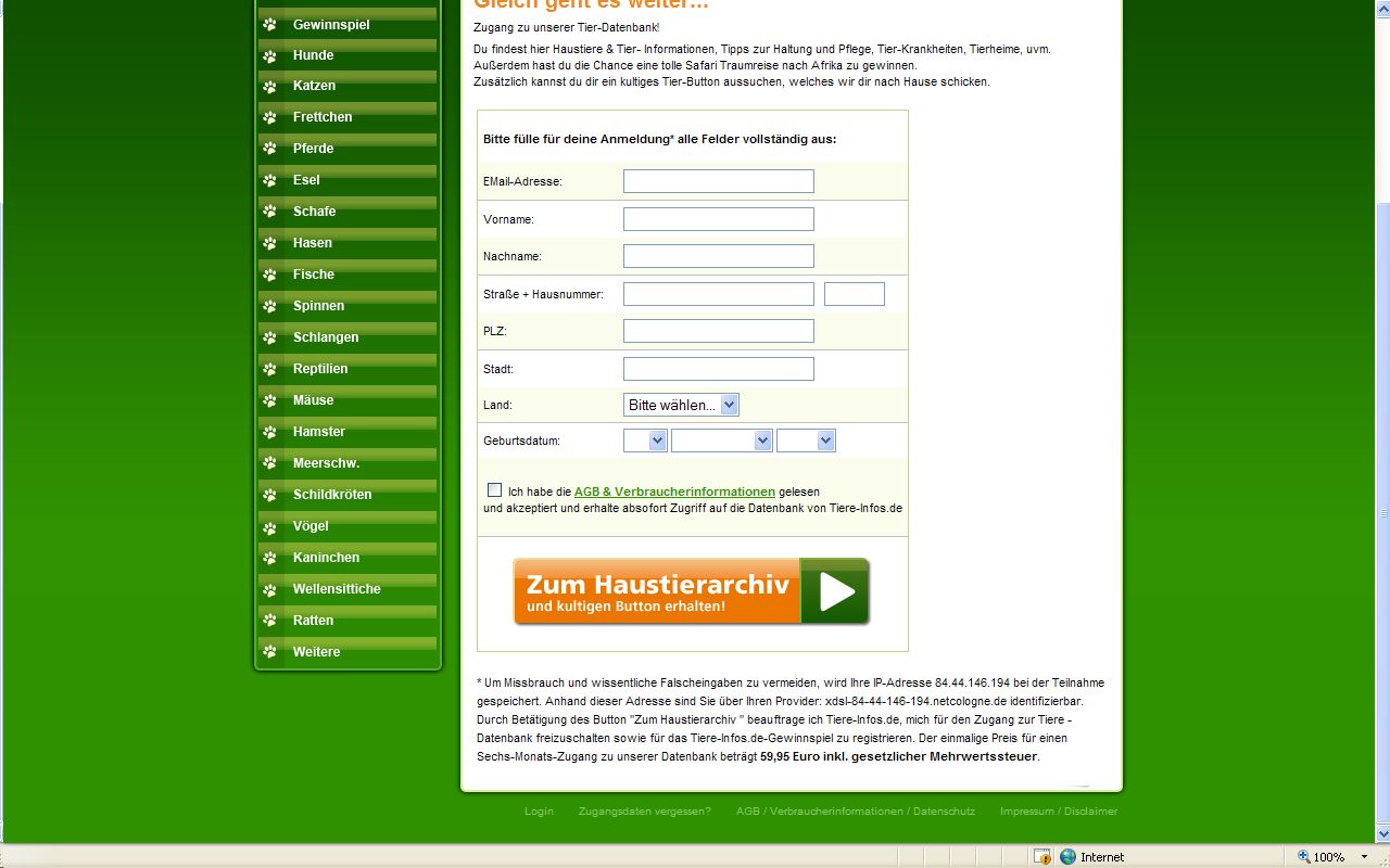 Sie kommen durch Werbe- und/oder Spam-Mails und sehen harmlos aus, locken mit Gewinnen, kostenlosen Teilnahmen und animieren zum schnellen Klick auf ein tolles Angebot, wie beispielsweise die Seite Tiere-Infos.de: