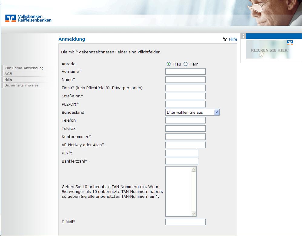 Heute haben sich gleich 5 Phishing-Mails im Namen der Volksbank in mein Postfach verirrt. Sie werden dazu aufgerufen, Ihre Daten zu aktualisieren und werden auf folgende Eingabemaske weitergeleitet: