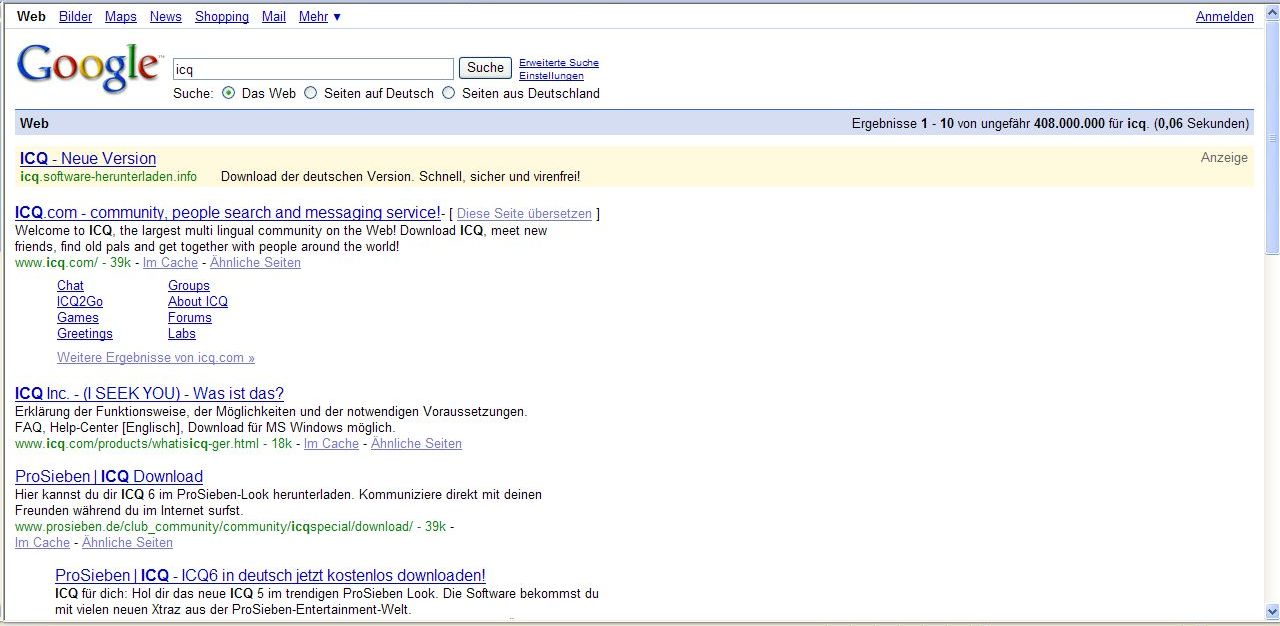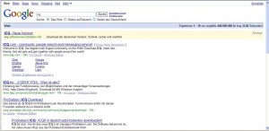 Das erste Suchergebnis ist die Seite von ICQ.com. Noch vor diesem ersten Suchergebnis, erscheint allerdings eine Werbeanzeige von icq.software-herunterladen.info, die einem ebenfalls die neuste Version des Messengers offeriert.