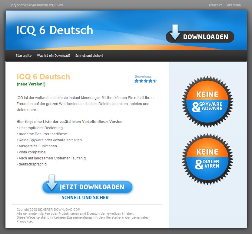 Wer sich für das erste Suchergebnis, also die Anzeige für icq.software-herunterladen.info entscheidet, wird lt. Impressum auf eine Seite von
