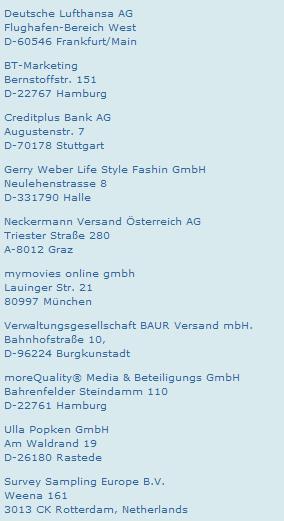 Auch Bertelsmann sollte in dieser Liste enthalten sein, denn der Einkaufsgutschein i. H. v. Euro 50,-, der die Anmeldung für Townbuddy.net attraktiver macht, wird gesponsert. Doch wer sind die Anbieter, die solche Angebote und Personen unterstützen?