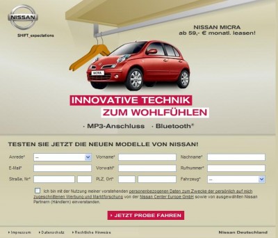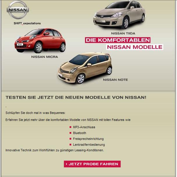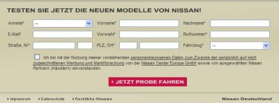 Über den Werbeverteiler der BT-Marketing Ltd. können Sie sich bei Nissan für eine Probefahrt anmelden. Anders als andere Autohändler, wo man heute froh über Neukunden ist, scheint Nissan einen erfolgreichen Weg gefunden zu haben die Werbekosten durch ein Werbeeinverständnis (Nutzung Ihrer persönlichen Daten zu Werbezwecken) zu reduzieren.