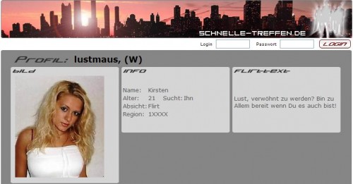 Das Angebot von schnelle-treffen.de spricht vor allem die männlichen User an, denn der erste Blick fällt auf sehr reizvolle Damen, die nur darauf warten kontaktiert zu werden. Der Erstkontakt ist übrigens kostenlos, doch wie kann sich das Angebot von schnelle-treffen.de finanzieren? Gehen wir den Weg doch mal gemeinsam und schauen uns das Profil von Kirsten 21 (Lustmaus) an:
