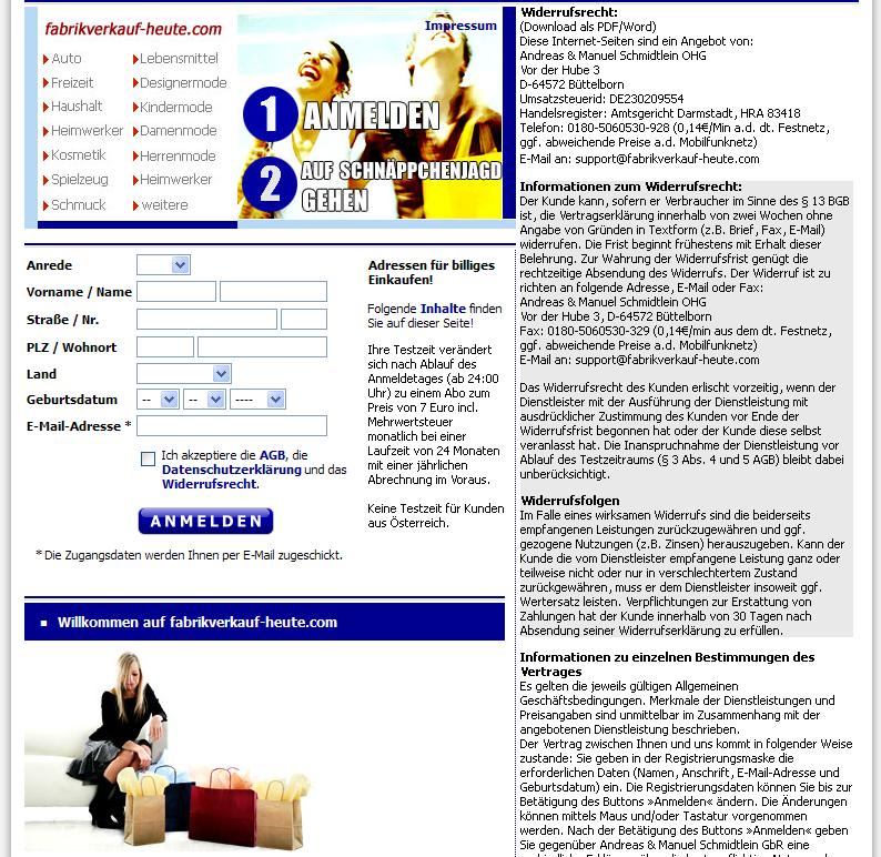 Nur am Rande, aber interssant finde ich eine Weiterleitung von der Seite Fabrikverkauf.de zu der Schmidtlein-Seite Fabrikverkauf-Heute.com. Lt. Sedo steht die Seite Fabrikverkauf.de zum Verkauf, doch das wird schon alles seine Richtigkeit haben!?