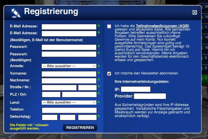 Natürlich haben Sie noch keine Million gewonnen, sondern lediglich die erste Gewinnstufe gemeistert. Das bedeutet, dass Sie bereits € 1,- in der Tasche haben, wobei jedes Spiel € 10,-kostet, was man nur schwer aus einem Fließtext des darauf folgenden Registrierungsformulars entnehmen kann: