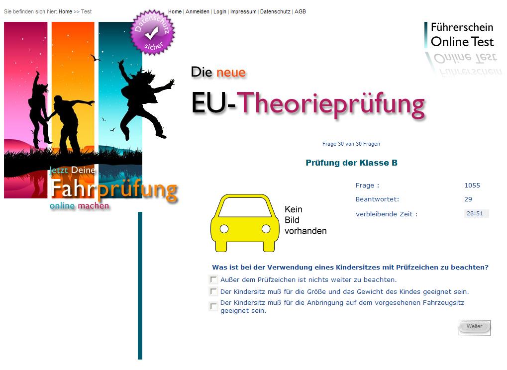 Nachdem Sie sich für eine Führerscheinklasse entschieden haben, müssen Sie die nachfolgenden 30 Fragen binnen 30 Minuten beantworten: