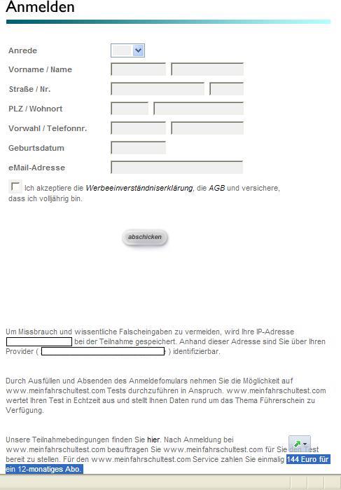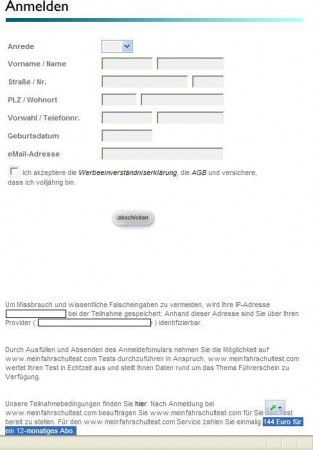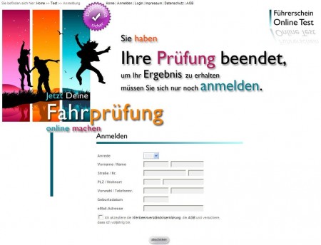 Via E-Mail wurde ich auf eine weitere Kostenfalle der New Content GmbH unter dem Geschäftsführer Herrn Robert Giese auf meinfahrschultest.com aufmerksam gemacht. Nachdem zunächst der Eindruck erweckt wird, dass es sich um ein kostenloses Angebot handelt und 30 Prüfungsfragen ohne Anmeldung beantwortet werden können, folgt das Anmeldeformular ohne Kostenhinweis um die Auswertung zu sehen.