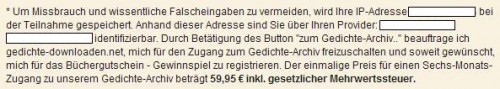 Der Kostenhinweis von € 59,95,- für Gedichte-Downloaden.net befindet sich mal wieder in einem Fließtext am Ende der Seite und wird wohl von den wenigsten Usern wahr genommen: