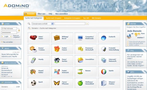 Die derzeit über 2.400 TOP-Domains gliedern sich in 20 Kategorien und über 300 Untergruppen um eine einfache Suche zu gewährleisten und erzeugen täglich bis zu 20.000 Besucher/Tag . Bei der Projektentwicklung wurde auf einfache Benutzbarkeit, Übersichtlichkeit und zuverlässige Funktion höchsten Wert gelegt.