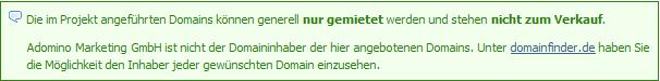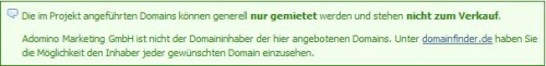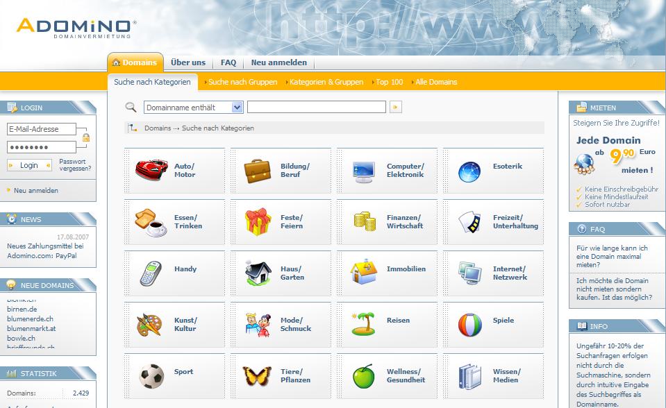 Adomino.com ist ein Projekt von Adomino Marketing GmbH und das weltweit erste Domainvermietungs-Projekt das vollautomatisch nach Domainaufrufe abrechnet und über 2.400 TOP-Domains zur Vermietung anbietet. Der durch die gemietete Domains erzeugte hochwertige Traffic kann auf die eigene Webpräsenz geleitet werden und ist somit eine preisgünstige Alternative zum Suchmaschinen-Traffic. Es besteht die Möglichkeit den Domain-Traffic für eine gewisse Mietdauer, maximale Kosten oder maximale Domain-Aufrufe zu buchen.