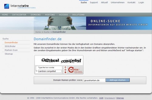 Diesem Rat folge ich natürlich und schaue mir unter domainfinder.de einmal an, wer denn jetzt für die Domain Grusskarten.de verantwortlich ist. Zunächst stelle ich fest, dass ich auf internetwire.de der InterNetWire Communications GmbH weitergeleitet werde: