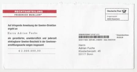 Ich habe mal wieder interessante Post erhalten. Diesmal geht es um einen „unwiderruflichen, garantierten und jederzeit einklagbaren Gewinn-Bescheid der eingetragenen Konzernmarke Friedrich Müller über 2 Millionen Euro“. Doch warum ist dieser Gewinn so teuer?