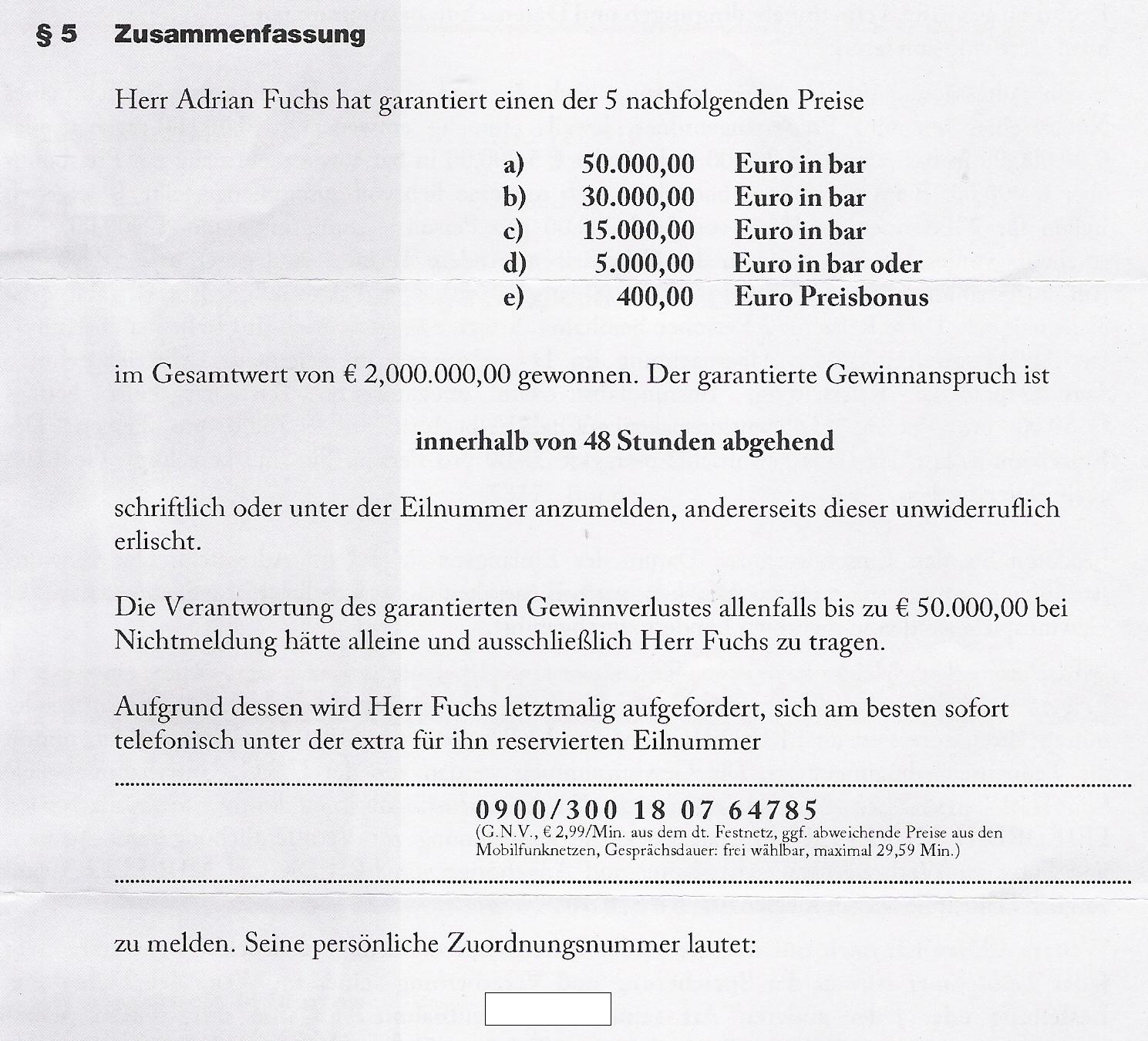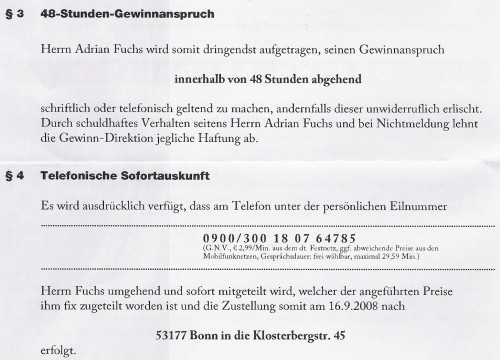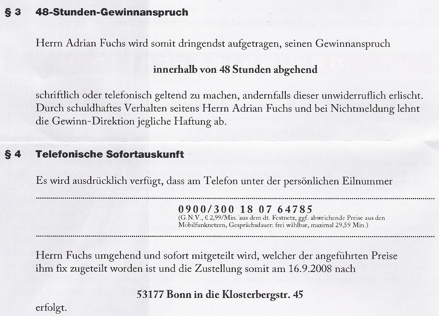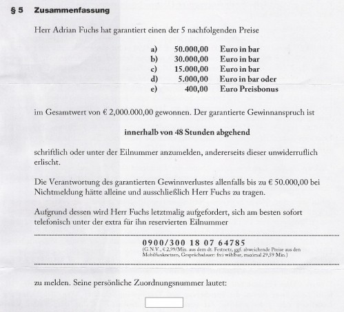 Der eigentliche Zweck dieser „Kampagne“ liegt wohl in der Geltendmachung des Gewinnanspruches, welche über eine kostenpflichtige 0900-Nummer erfolgen soll: