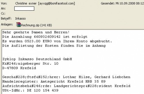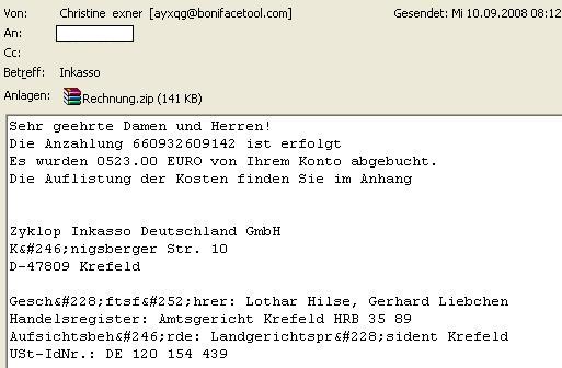 Diese Emails werden nicht von Zyklop Inkasso versendet, der Absender ist gefälscht und das angehängte Dokument beinhaltet einen Trojaner. Seitens Zyklop wurde bereits Strafantrag gestellt .