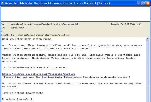 Die Mail vom Verteiler der EuMedien GmbH mit dem Empfehlungslink der kajomi GmbH für das Abzockangebot Reisetester.com der ASK AG: