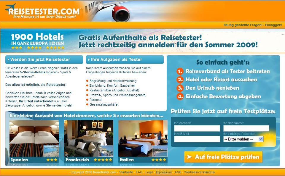 Der in der Werbemail enthaltene Link leitet Sie auf das Abzockangebot von Reisetester.com der ASK AG weiter. So sieht die Zielseite über den Werbelink der kajomi GmbH aus: