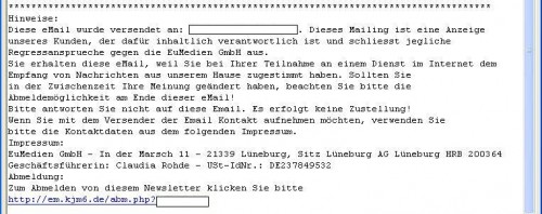 Das der Werbeverteiler der EuMedien Gmbh als Dreckschleuder für Abzockangebote dient, die als Empfehlungslink von der kajomi GmbH versendet werden, ist zumindest für mich nichts neues. Am Beispiel einer aktuellen Werbemail kann man wieder sehr gut erkennen, wie renommierte Vertreter unserer Wirtschaft vom Datenhandel profitieren, was man dabei in Kauf nimmt und wie man sich bewusst seiner Verantwortung entzieht.