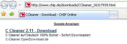 Doch nicht nur die „Sponsoren-Links“ der Suchergebnisse sind nicht gefiltert, wie die Google-Anzeigen anhand des Beispiels „Ccleaner“ offenbaren: