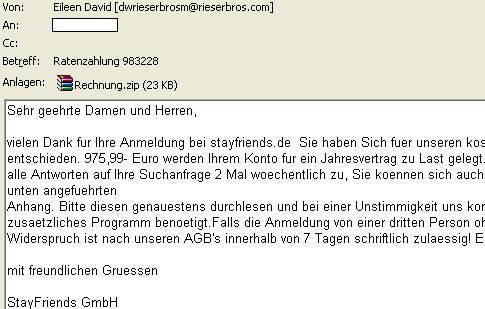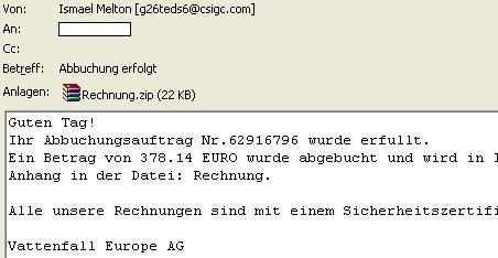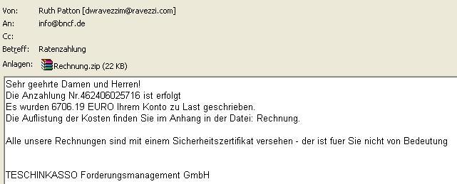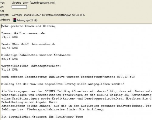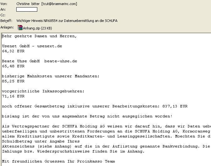 Eine Spam-Welle dieses Ausmaßes hat es schon lange nicht mehr gegeben. Gleich 8 Spam-Mails mit angeblichen Forderungen der Schufa, Inkassobüros wie Proinkasso oder Teschinkasso und Ratenzahlungsvereinbarungen für die Nutzung von Usenext.de, Beate-Uhse.de, Stayfriends.de oder auch Vattenfall haben heute wohl den Weg in mehrere tausend Postfächer gefunden – Um Ihnen einen Trojaner unterzuschieben.