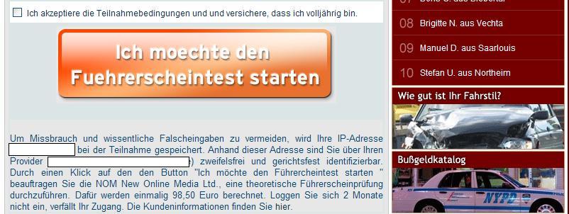 Die Abzocke mit vermeintlichen Online-Fahrprüfungen ist anscheinend immer ein sehr lukratives Geschäftsmodell. In der Vergangenheit waren es Seiten wie Fahrschulquiz.de der mittlerweile insolventen Bulltrade AG oder Meinfahrschultest.com der New Content GmbH. Dieses Konzept hat auch die NOM – New Online Media Ltd. aufgegriffen.