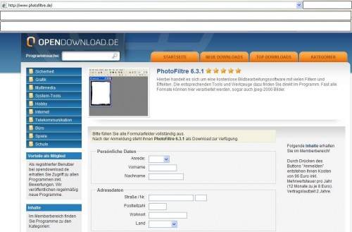 Photofiltre ist eigentlich ein sehr beliebtes und vor allem kostenloses Tool um Bilder zu bearbeiten. Anscheinend genau das Richtige für die Content Services Ltd., denn hinter der Seite Photofiltre.de verbirgt sich das Abzockangebot Opendownload.de – Die ersten Opfer melden sich bereits im Forum von Computerbild zu Wort.