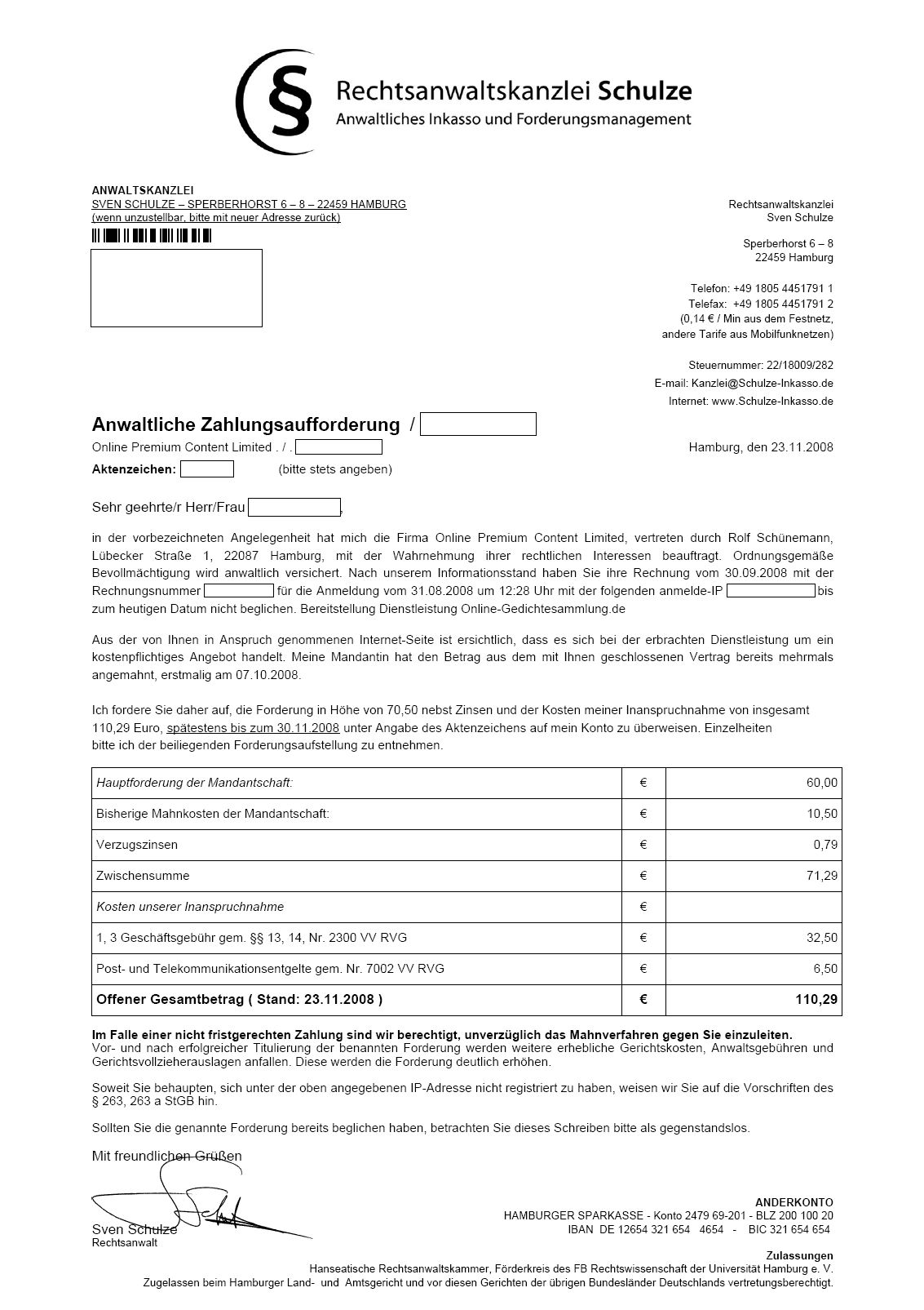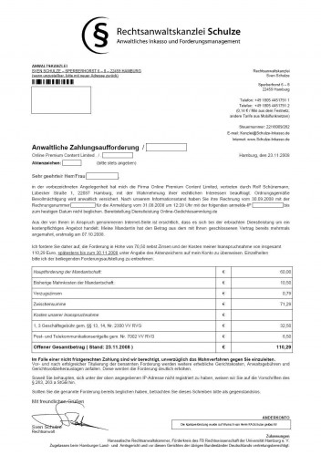 Die Online Premium Content Ltd. ist ein Abzockunternehmen mit einer langjährigen Tradition. Interessant sind immer wieder die Kooperationen und Partner, die bei der Eintreibung unterstützen sollen, doch was ich selbst mit der Kanzlei Schulze erleben durfte, möchte und werde ich Ihnen natürlich nicht vorenthalten.