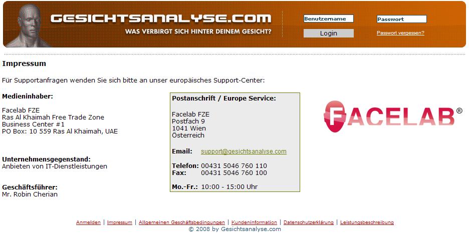 Ein Screenshot von Gesichtsanalyse.com der Facelab FZE vom 19.11.2008: