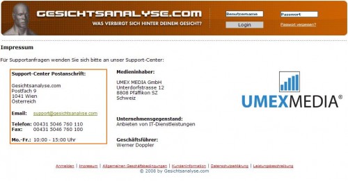 Ein Screenshot von Gesichtsanalyse.com der Umex Media GmbH vom 08.01.2009:
