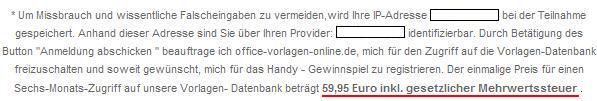 Als zusätzliche Motivation, seine persönlichen Daten einzutragen, wird man mit einem Handy-Gewinnspiel geködert, jedoch fehlt auch hier ein klarer Hinweis auf die Kosten. Den Hinweis findet man nur (nebst den AGB) in einem Fließtext am Ende der Seite: