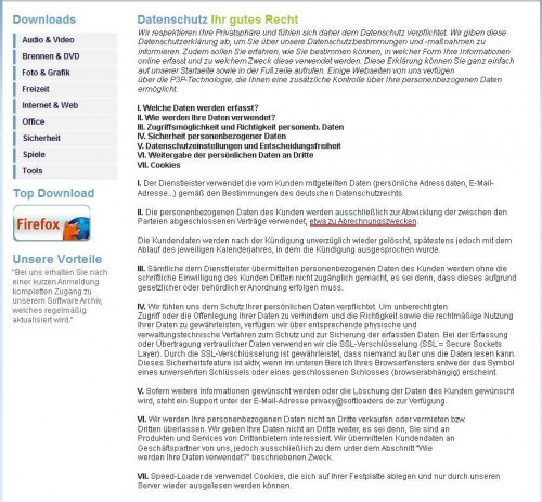 Auch hier gibt es keinen Hinweis auf Kosten. Diese Screenshots sind vom 04.03.09, doch die hier erwähnte Datenschutzerklärung, welche Sie akzeptieren müssen, nimmt bereits Bezug auf ein kostenpflichtiges Angebot: