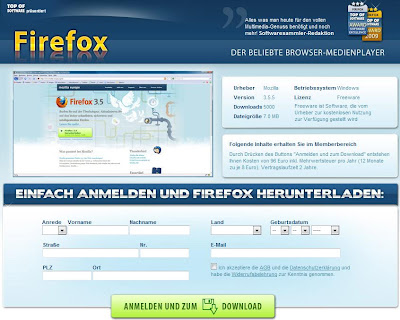 Wer diesen Link verfolgt wird auf eine der (wahrscheinlich unzähligen) Landingpages bzw. Lockvogelseiten von Top-of-Software.de weitergeleitet, welche schon Valentin Fritzmann mit Mega-Downloads.net exzessiv eingesetzt hat – Hier ist es der beliebte Browser Firefox: